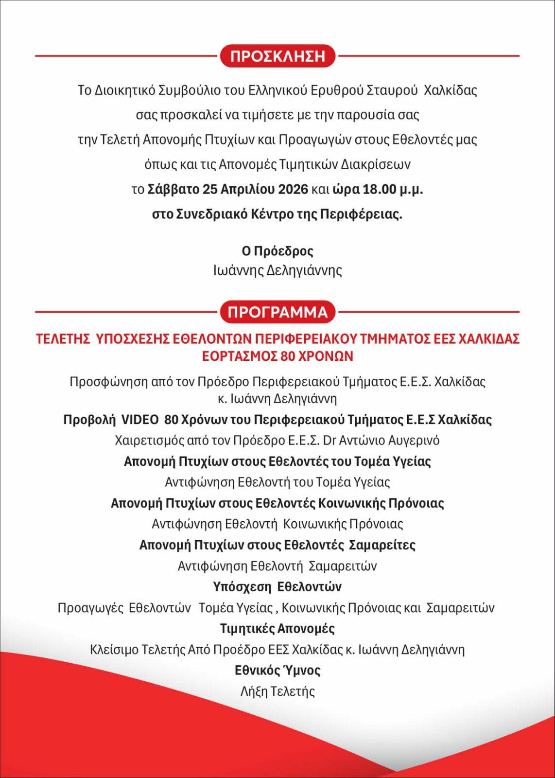 Τελετή απονομής πτυχίων και προαγωγών, αλλά και απονομές τιμητικών διακρίσεων διοργανώνει Ο Ελληνικός Ερυθρός Σταυρός Χαλκίδας.