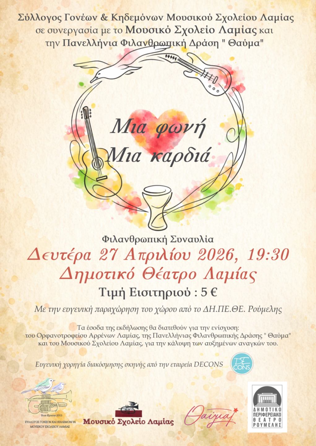 Ο Σύλλογος Γονέων και Κηδεμόνων του Μουσικού Σχολείου Λαμίας, σε συνεργασία με το Μουσικό Σχολείο Λαμίας και την Πανελλήνια Φιλανθρωπική Δράση «Θαύμα», διοργανώνει τη φιλανθρωπική συναυλία «Μια φωνή, μια καρδιά», τη Δευτέρα 27 Απριλίου 2026 και ώρα 19:30, στο Δημοτικό Θέατρο Λαμίας, με την ευγενική παραχώρηση του χώρου από το ΔΗΠΕΘΕ Ρούμελης.