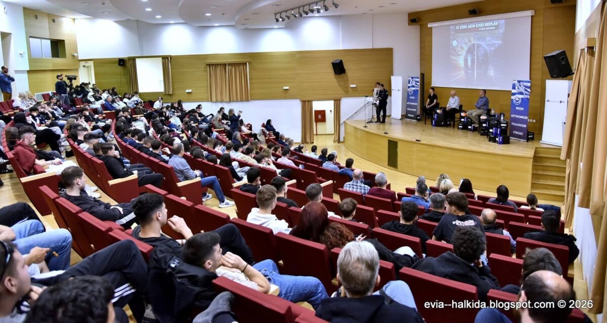 Πάνω από 200 μαθητές Λυκείου παρακολούθησαν ενημερωτική δράση της Ένωσης Αστυνομικών Υπαλλήλων Εύβοιας με εξειδικευμένους ομιλητές γύρω από την οδική ασφάλεια. Ο τίτλος ήταν « Η ΖΩΗ ΔΕΝ ΕΧΕΙ REPLAY – ΟΧΙ ΑΛΛΑ RIP ΣΤΟ ΔΡΟΜΟ». Πραγματοποιήθηκε σε συνεργασία με την β΄ Βάθμια εκπαίδευση Εύβοιας.