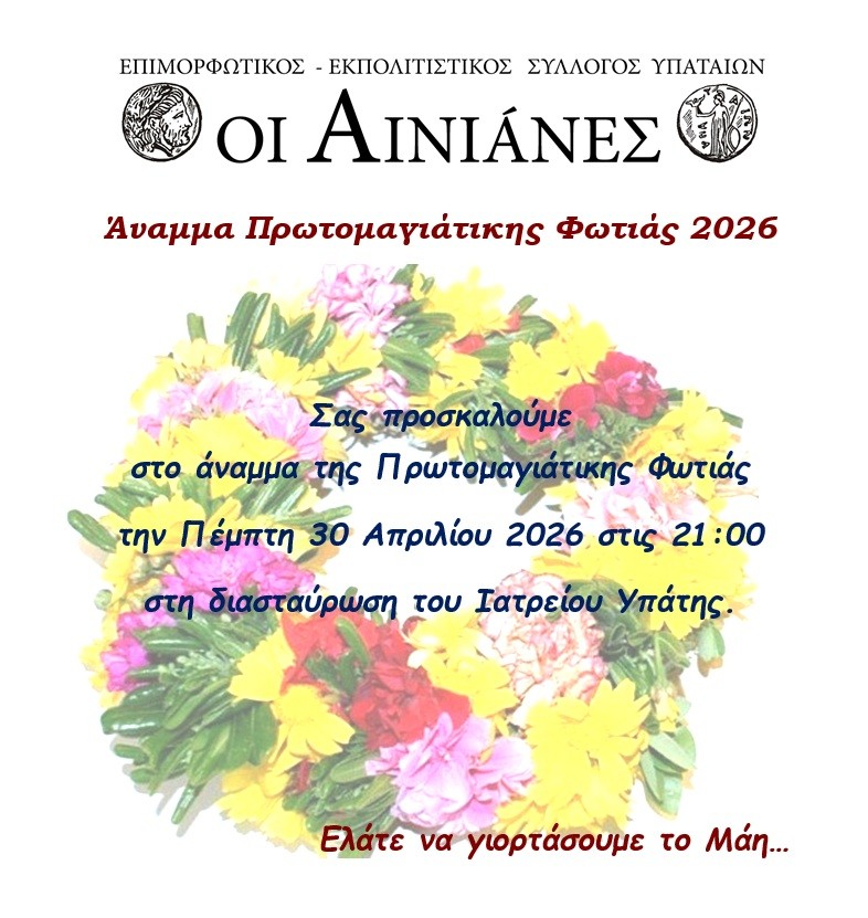 Έτσι, την ερχόμενη Πέμπτη 30 Απριλίου 2026 στις 21:00, στην διασταύρωση του Ιατρείου της Υπάτης, περιμένουμε όσους -μαζί με το περσινό πρωτομαγιάτικο στεφάνι τους- αποφασίσουν να γιορτάσουν μαζί μας το «Μάη που σήμερα προβάλλει στη γη».